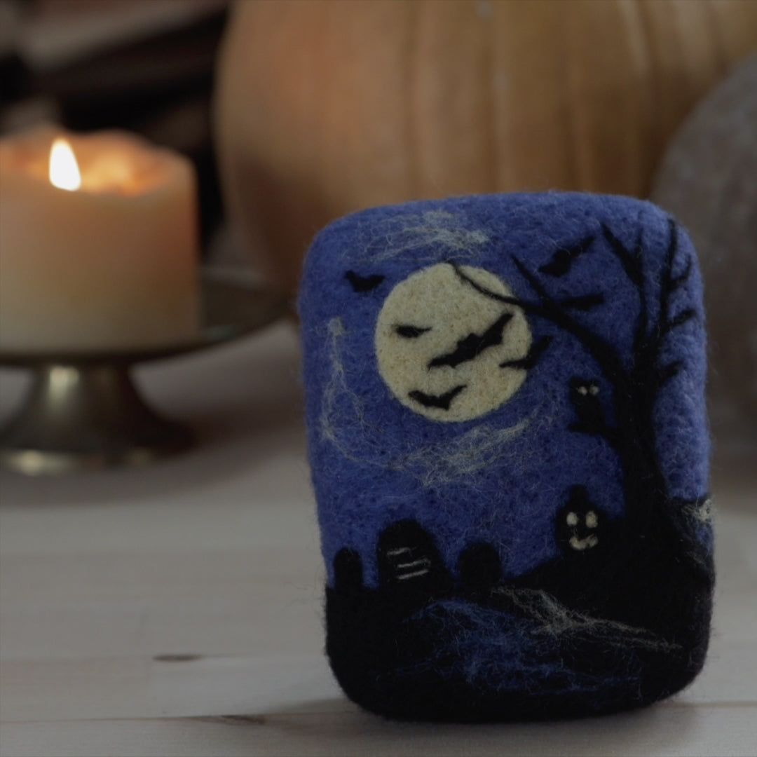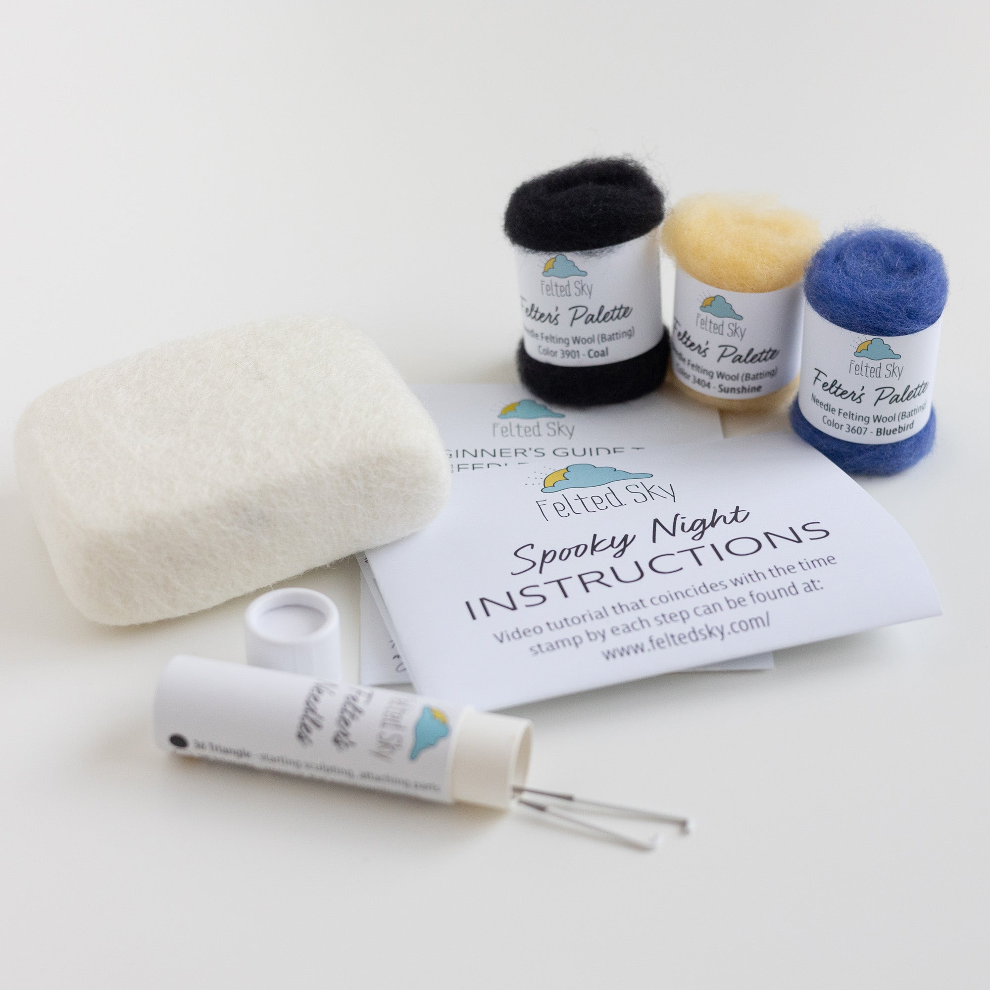 This needle felting kit includes everything needed to make one cute yet petite Halloween landscape. Perfect for a windowsill, little shelf, or work space. Learn how to "paint with wool" without a big investment.