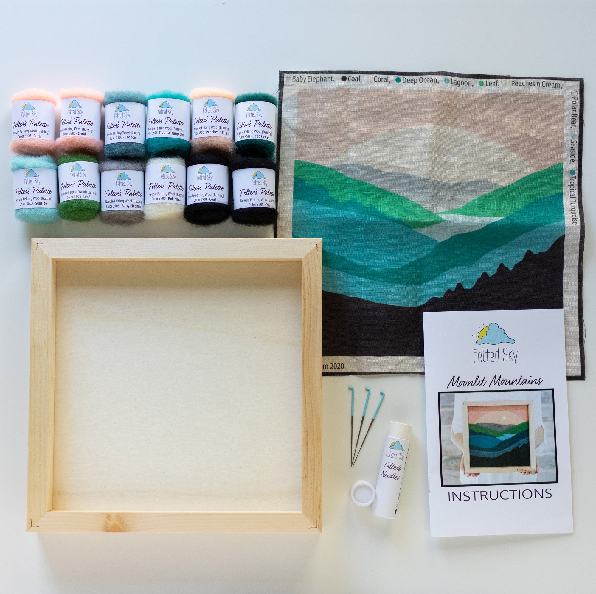 This modern landscape is an enjoyable way to ease into flat needle felting. Simply fill in the printed fabric picture with wool, similar to working with an embroidery or cross-stitch pattern. This is the felting equivalent of paint-by-number that you can proudly gift or display.