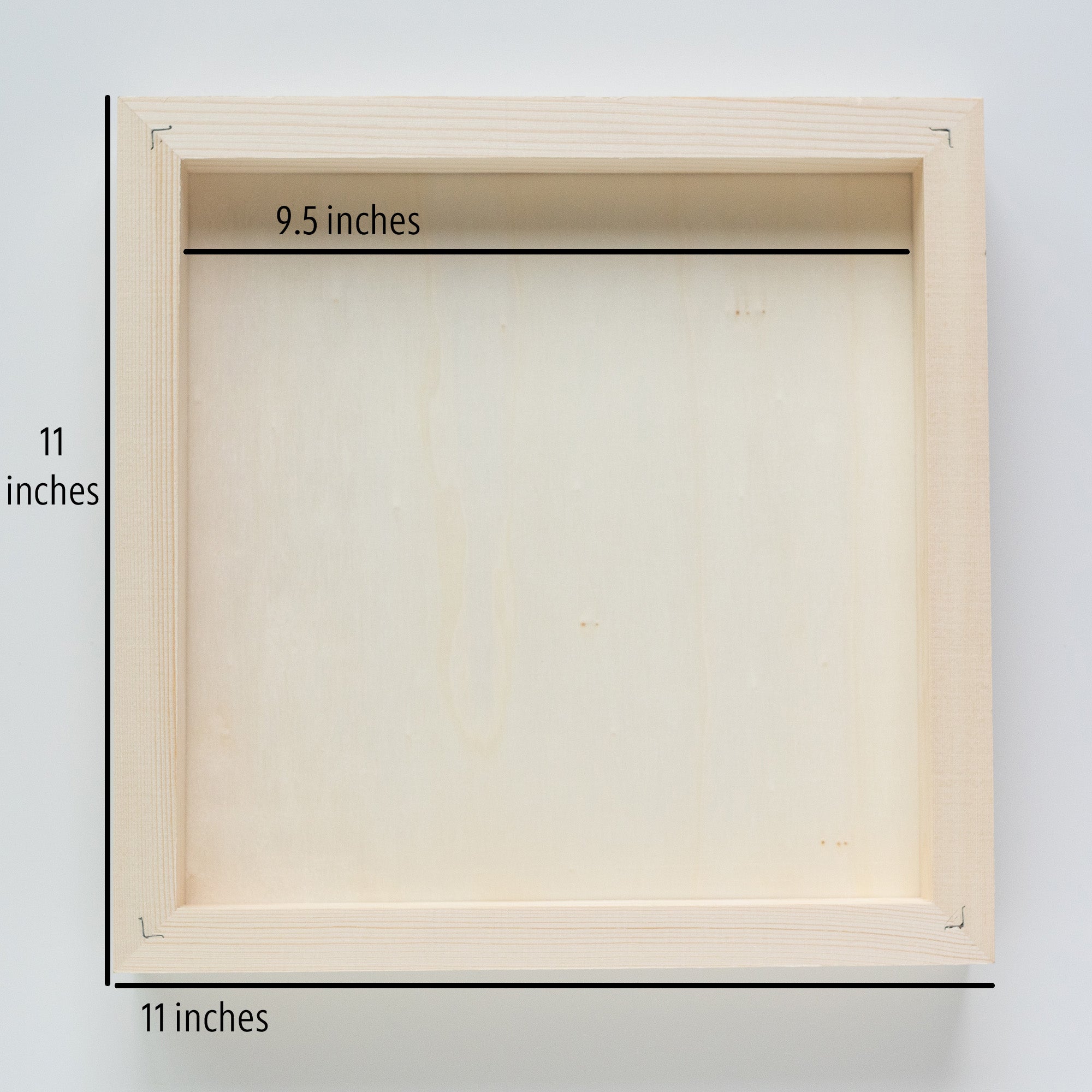 It is a square frame with outer dimensions of 11x11x2 inches. Artwork opening is 9.5x9.5 inches.