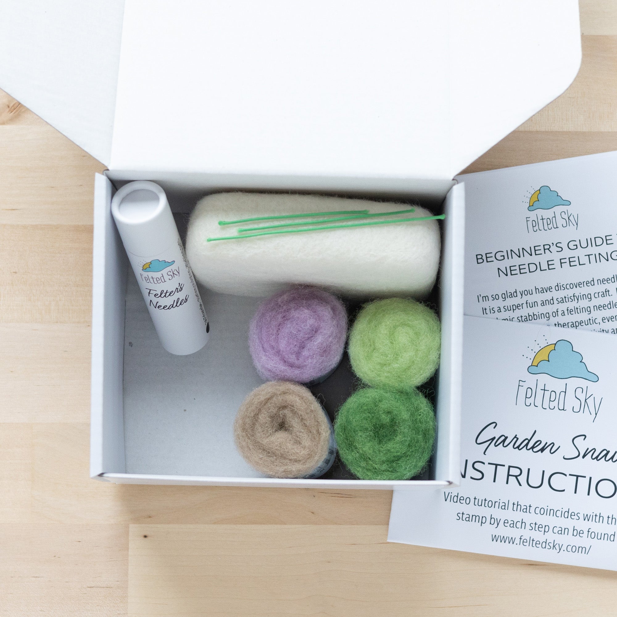 This needle felting kit includes everything needed to make one adorable snail sculpture complete with flowers and leaves. Perfect for a windowsill, little shelf, or work space.