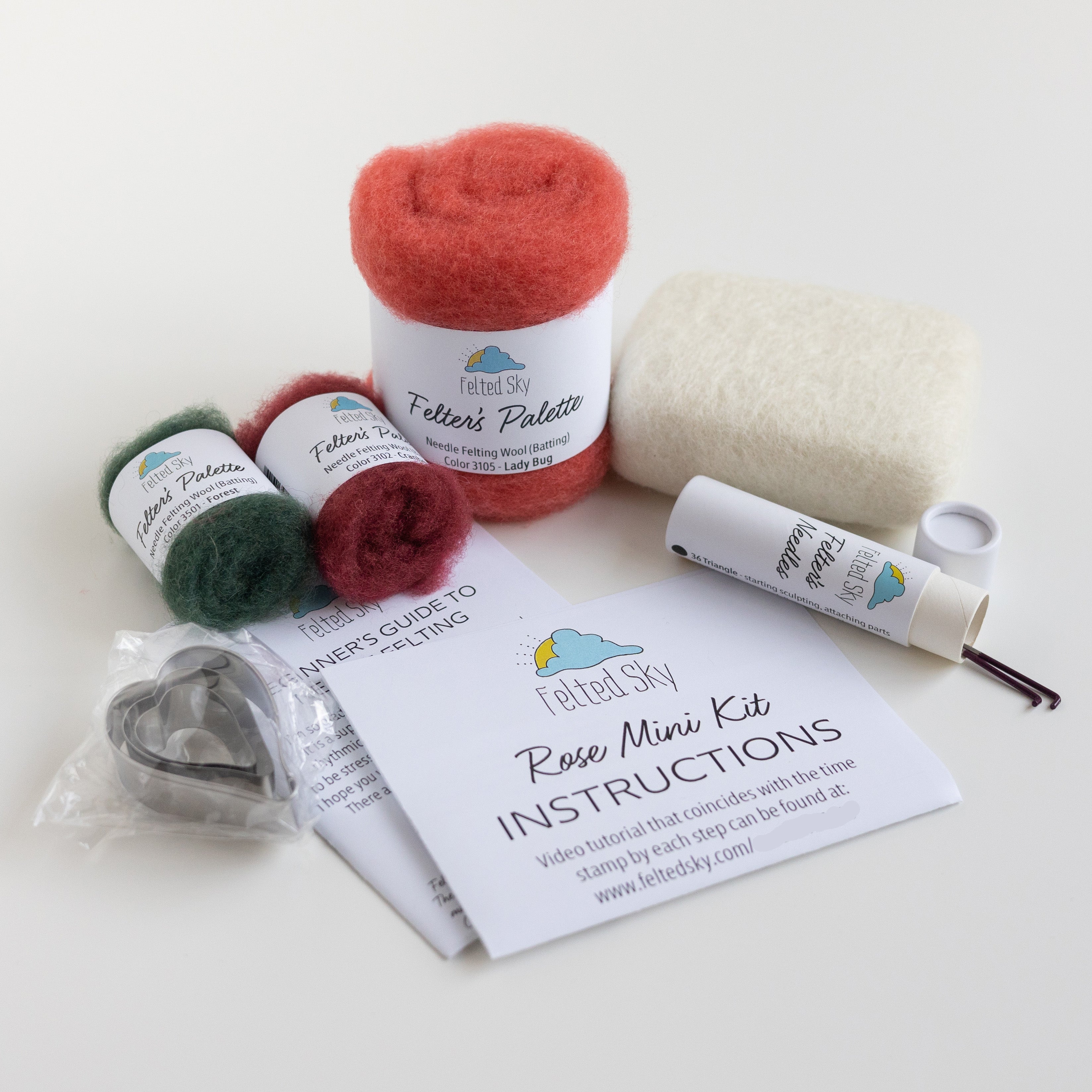 This needle felting kit includes everything needed to make one rose. You decide how and where to display it. This is a great kit for beginners because each petal is started with the help of a cookie cutter to make sizing and shaping easier.
