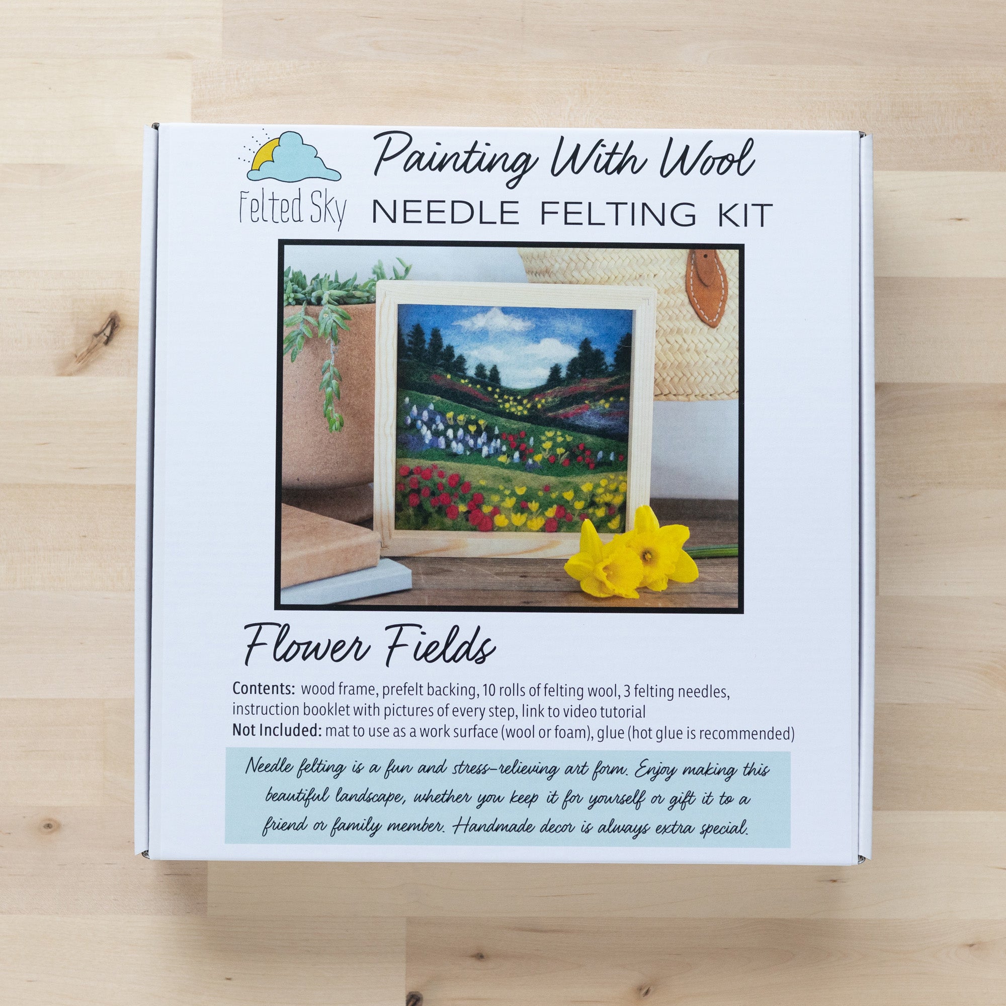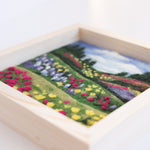 This is a cheerful landscape with lots of happy flowers and is very fun to make! This is an "advanced beginner" or "intermediate" kit. It is not much harder than our beginner hoop landscapes but it does help to have a little flat felting experience before you dive in. This kit comes with the frame. Leave it unfinished, or you can paint or stain it if you prefer.