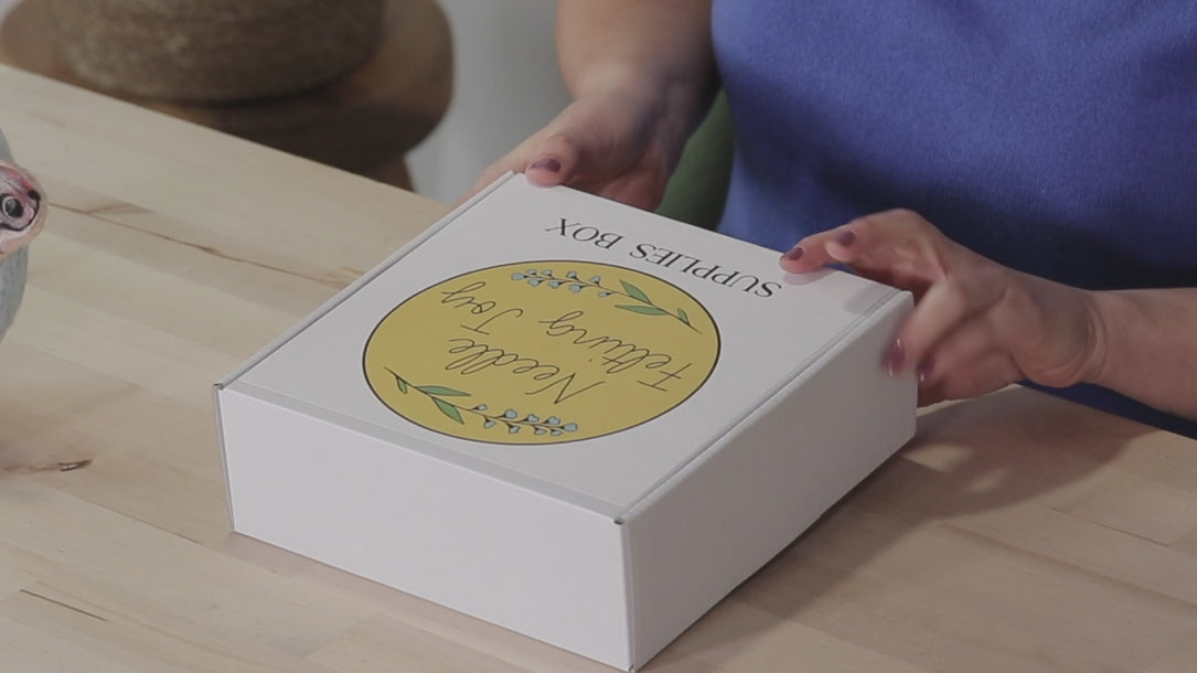 Supply boxes contain the wool, needles, backing materials and hoop (if applicable), a pattern template if needed, and a picture of the finished project. They do not contain an instruction sheet (projects are taught with a pre-recorded video tutorial), mats, or items used for finishing that are widely available and most people already have such as scissors, glue, pens, etc.