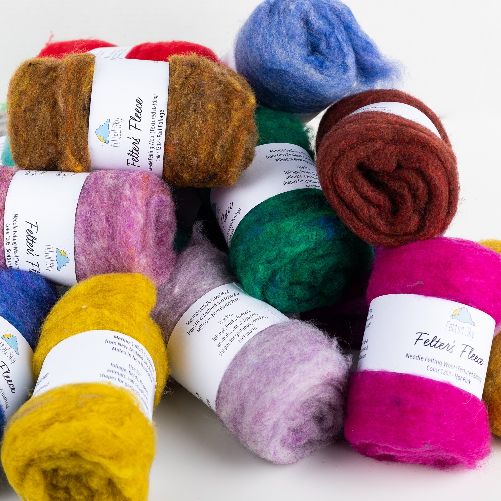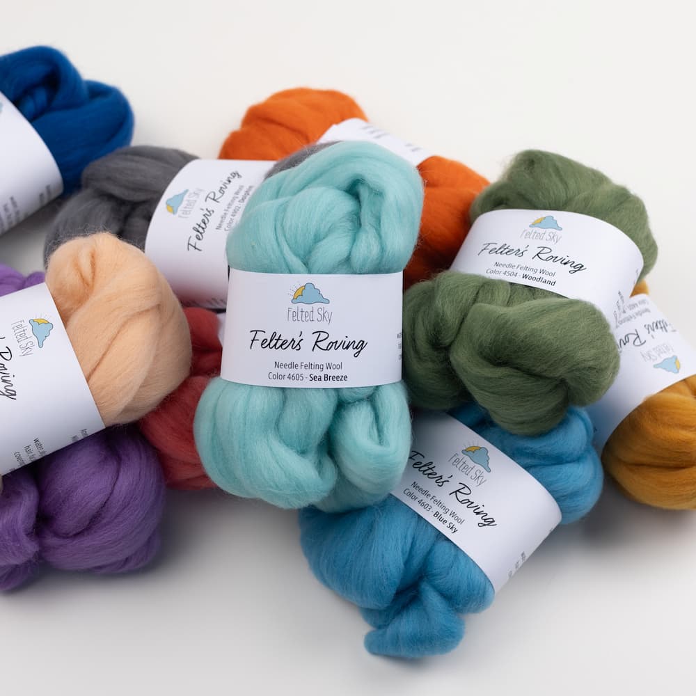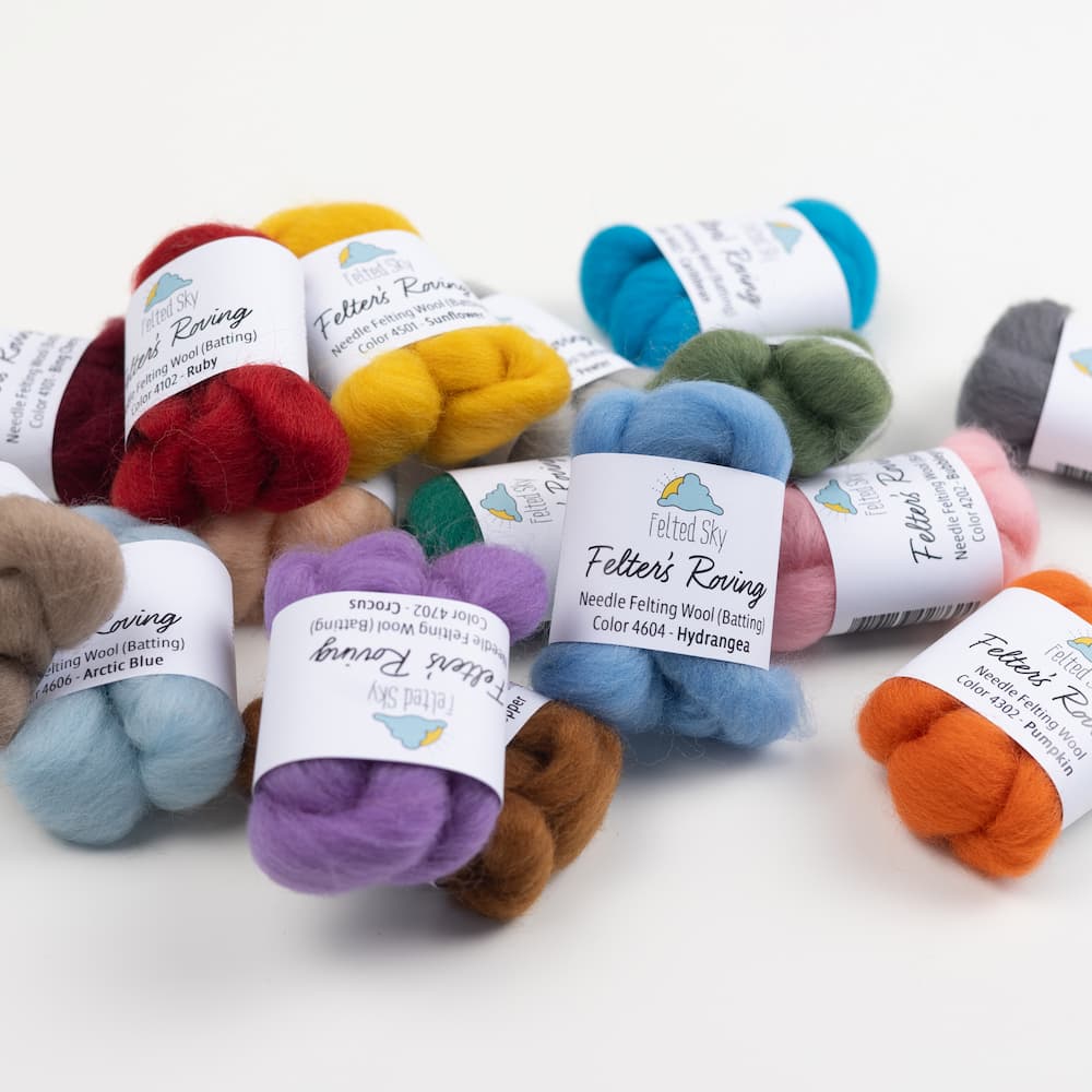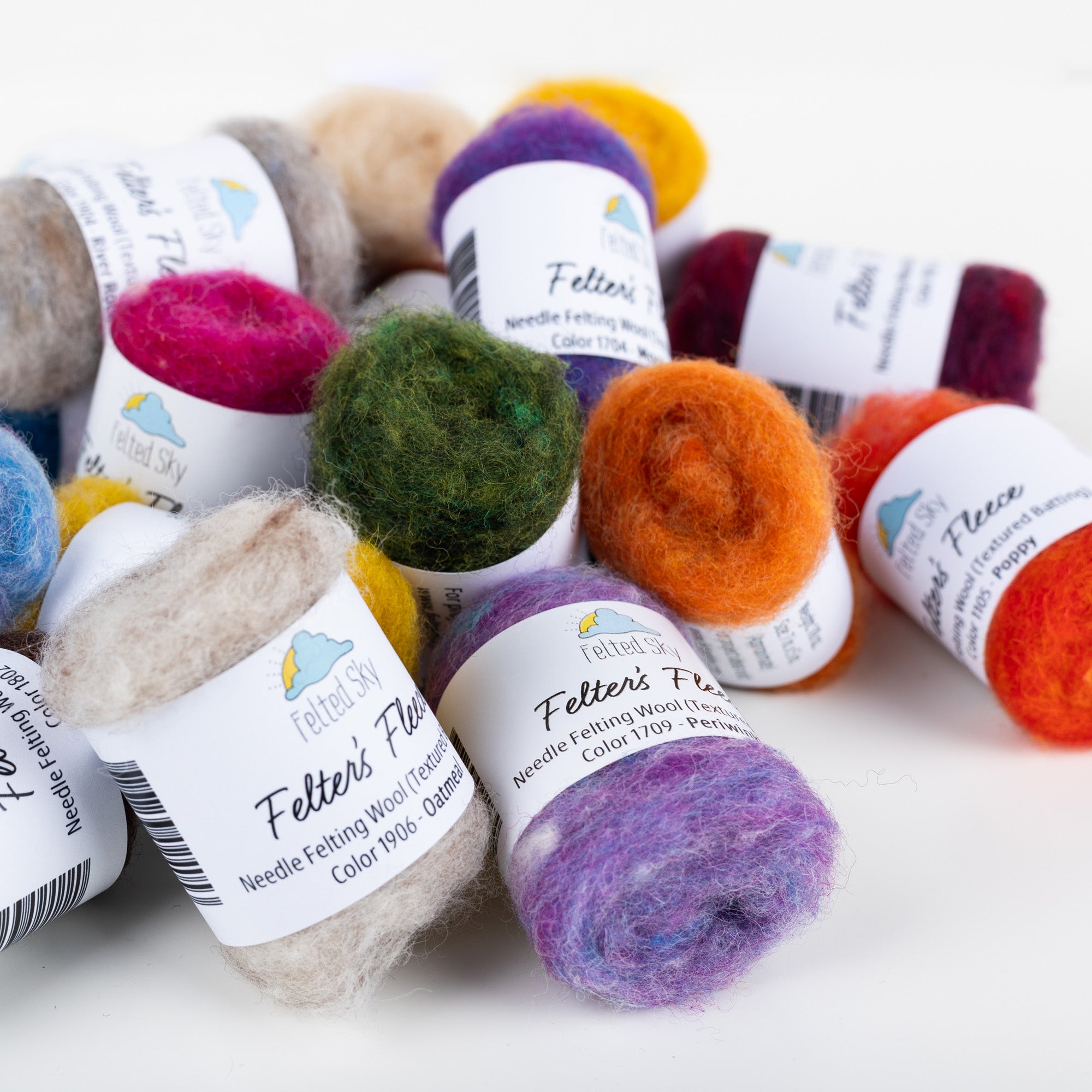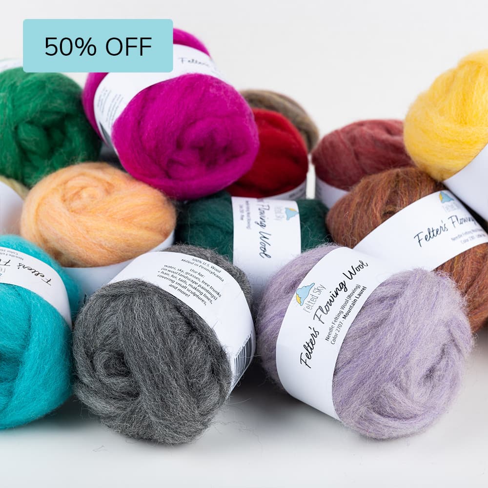 Using high quality felting wool can make a big difference in your felting experience and the beauty of your artwork! We currently carry three types of our favorite dyed felting wool + core wool. A fourth type, Felter's Flowing Wool, is on Clearance. Our wool colors can be purchased in an 1/8 oz. size (the same size that is used in our kits) or in a 1 oz. size.