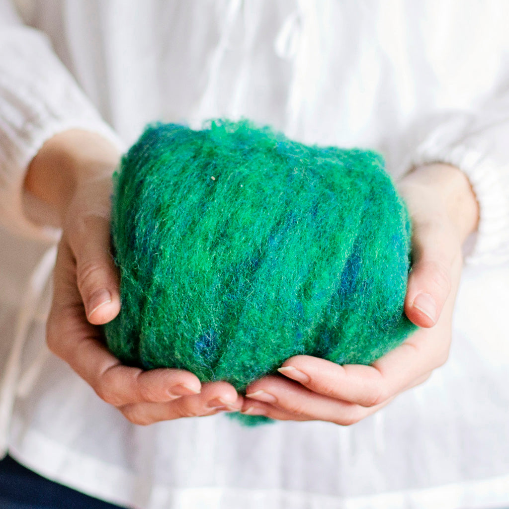 This is a beautiful and fluffy needle felting wool that comes in in gorgeous colors. It has a bit of texture to it, and almost all of the shades are heathered, with flecks of other colors running through them. We use this wool in many of our needle felting kits. It is particularly suited to becoming plants, trees, and little animals.