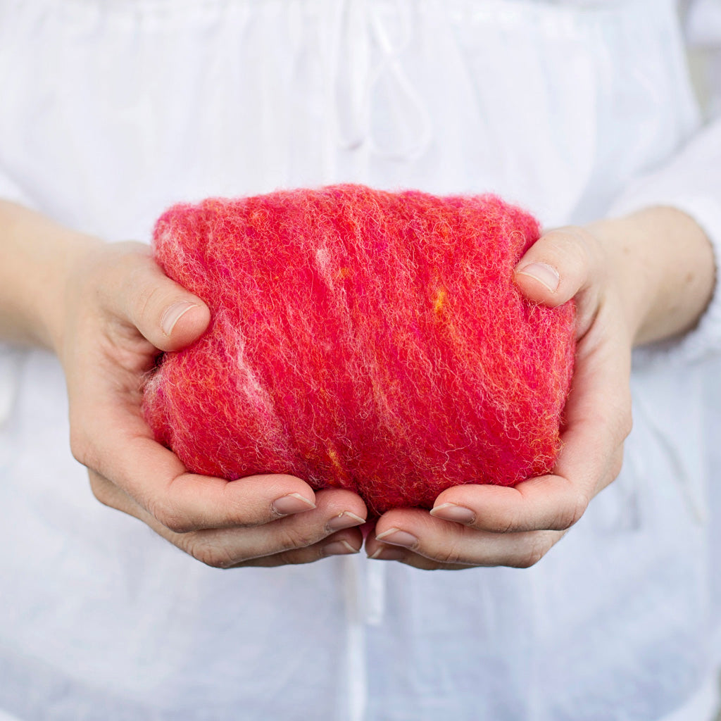 This is a beautiful and fluffy needle felting wool that comes in in gorgeous colors. It has a bit of texture to it, and almost all of the shades are heathered, with flecks of other colors running through them. We use this wool in many of our needle felting kits. It is particularly suited to becoming plants, trees, and little animals.