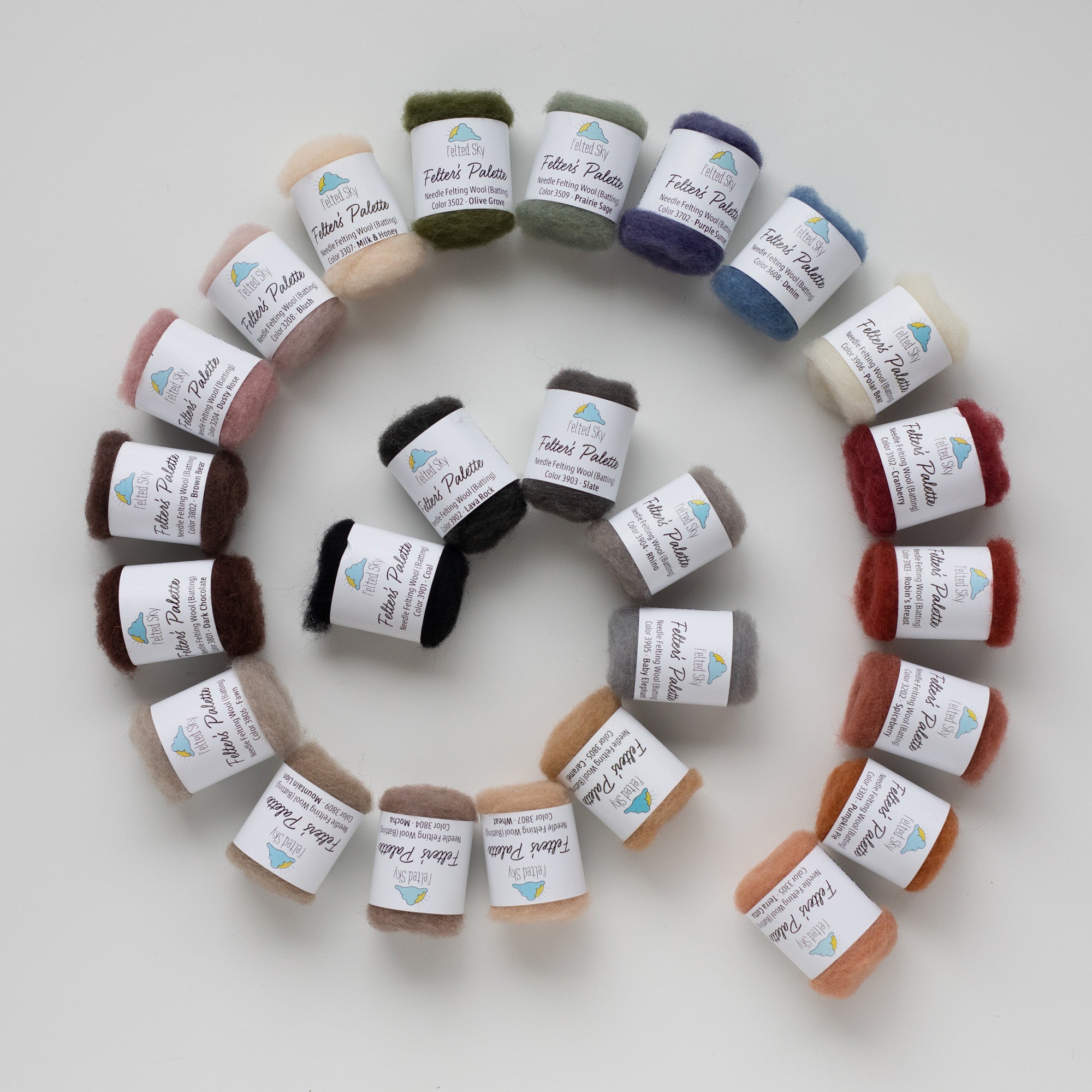 This is a box of 25 colors of felting wool - all 1/8 oz. rolls. This is the same size used in most of our kits. All of the wool in this box is Felter's Palette - a soft, short staple, solid colored wool batting.