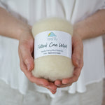 This wool is used in our sculptural needle felting kits to make the base shape that gets covered in colored wool. It also works well as a natural stuffing for all kinds of sewn decorations and small toys. It wet felts as well if you are looking to make your own backing for felted pictures or some dryer balls.