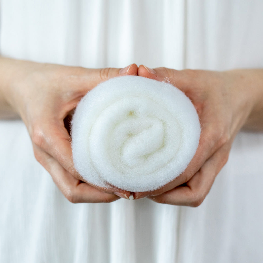 This fiber comes to us from DHG in Italy, as we have not been able to source a bleached true white in the US. It has been carded in the same way as the rest of our Felter's Palette wool and behaves very similarly.