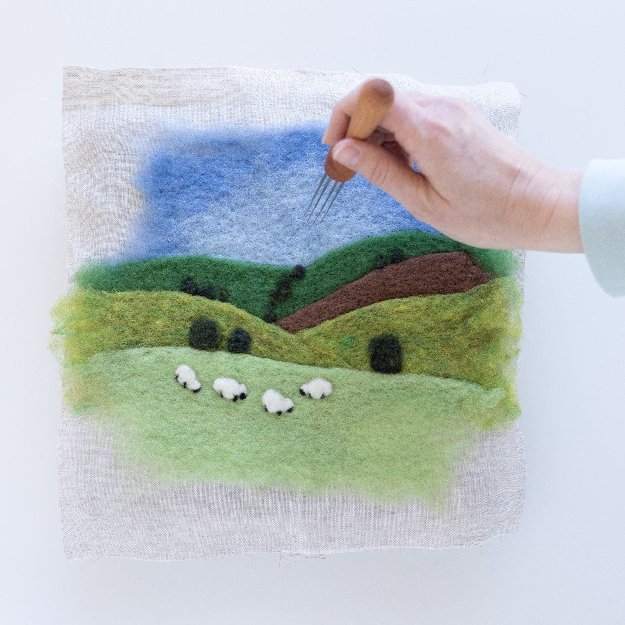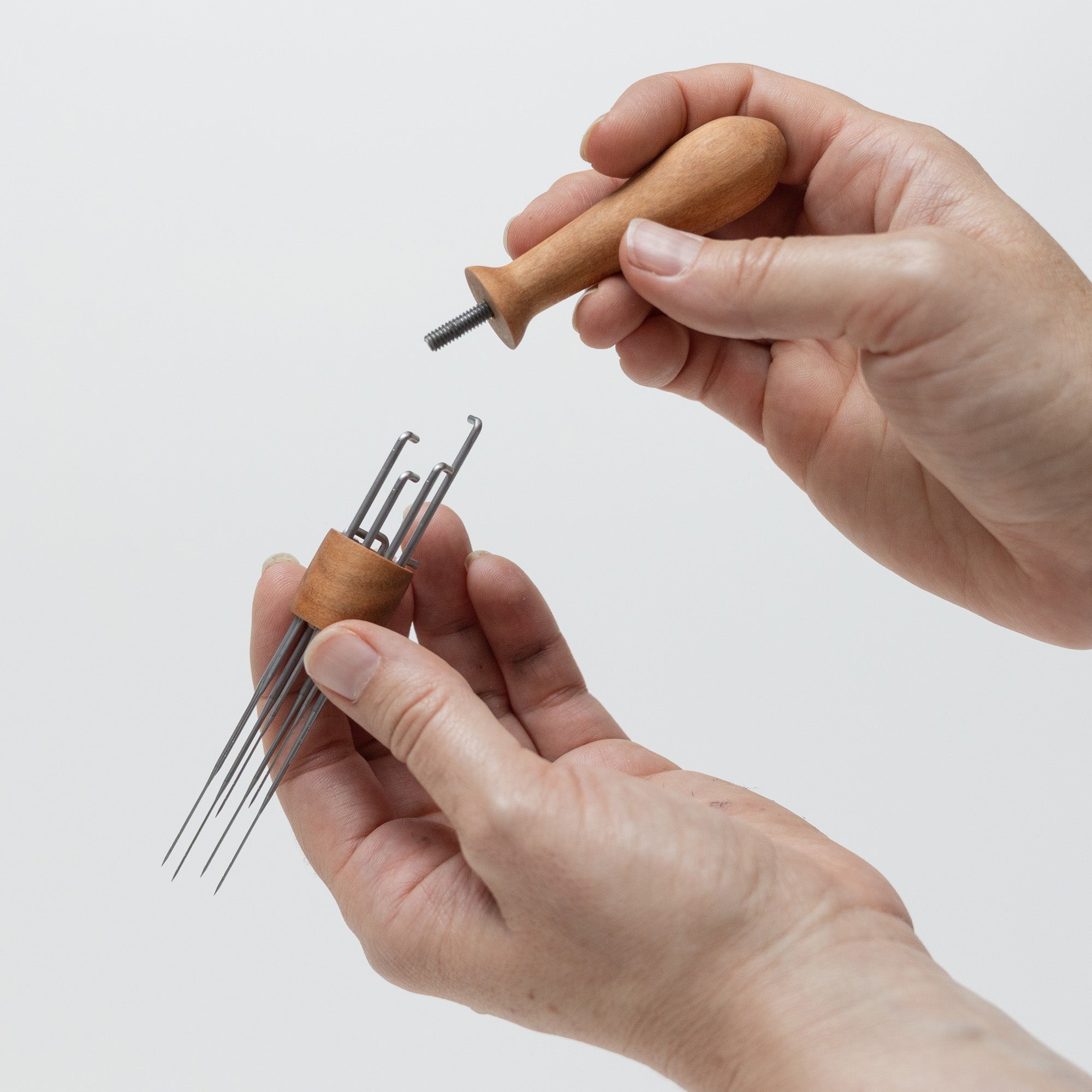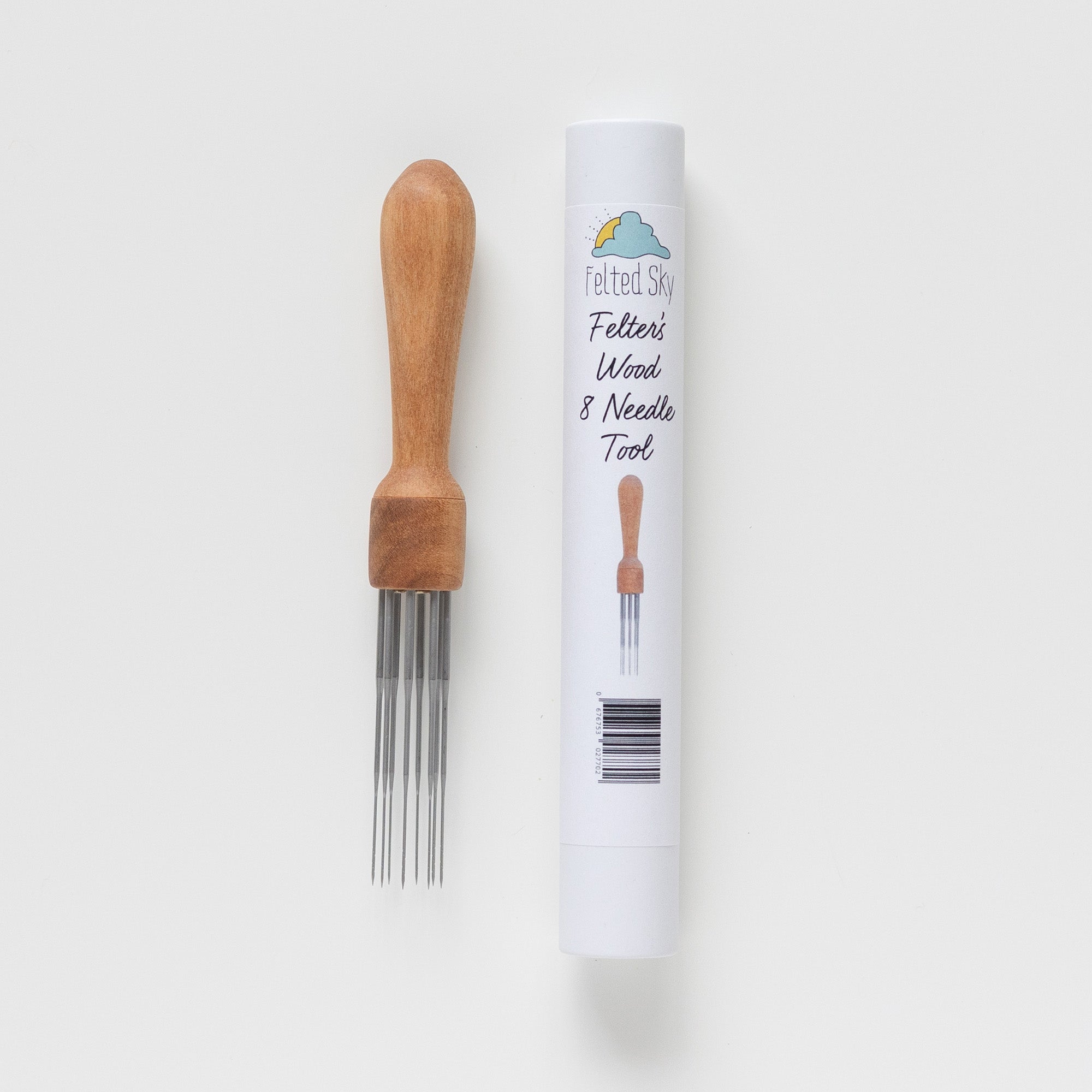 This needle felting tool is handmade in Kentucky from solid cherry wood. Beautiful and made to last, it comes with 8 of our 38 star needles but we like using it the best with four needles. You can decide how many needles you prefer in the tool and where to arrange them.